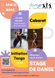 Stage de Cabaret sur talons avec Elodie BARTHE de 15h à 16h30 et initiation de Tango argentin avec Fabien DREVETON de 17h à 19h, à la salle de danse de la cité scolaire Jean PRÉVOST à Villard de Lans.